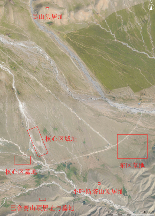 呼斯塔遗址总面积超12平方千米,城址面积广大、结构复杂、配套设施完备,是西天山地区青铜时代晚期罕见的核心聚落。从空中俯瞰,遗址由北至南错落分布着黑山头军事瞭望遗存、山前冲积扇核心城址、小呼斯塔山防御居址及多处墓地,构成了一套完整的“史前城池”防御体系。